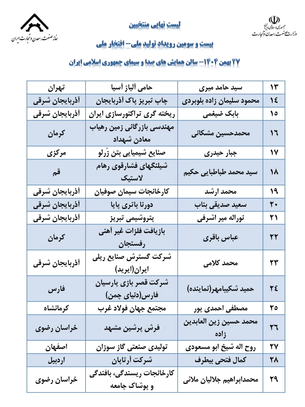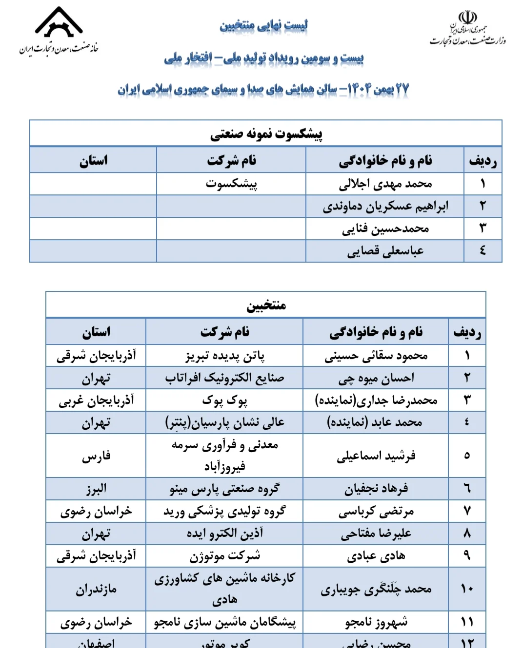 اسامی برگزیدگان به شرح زیر است: