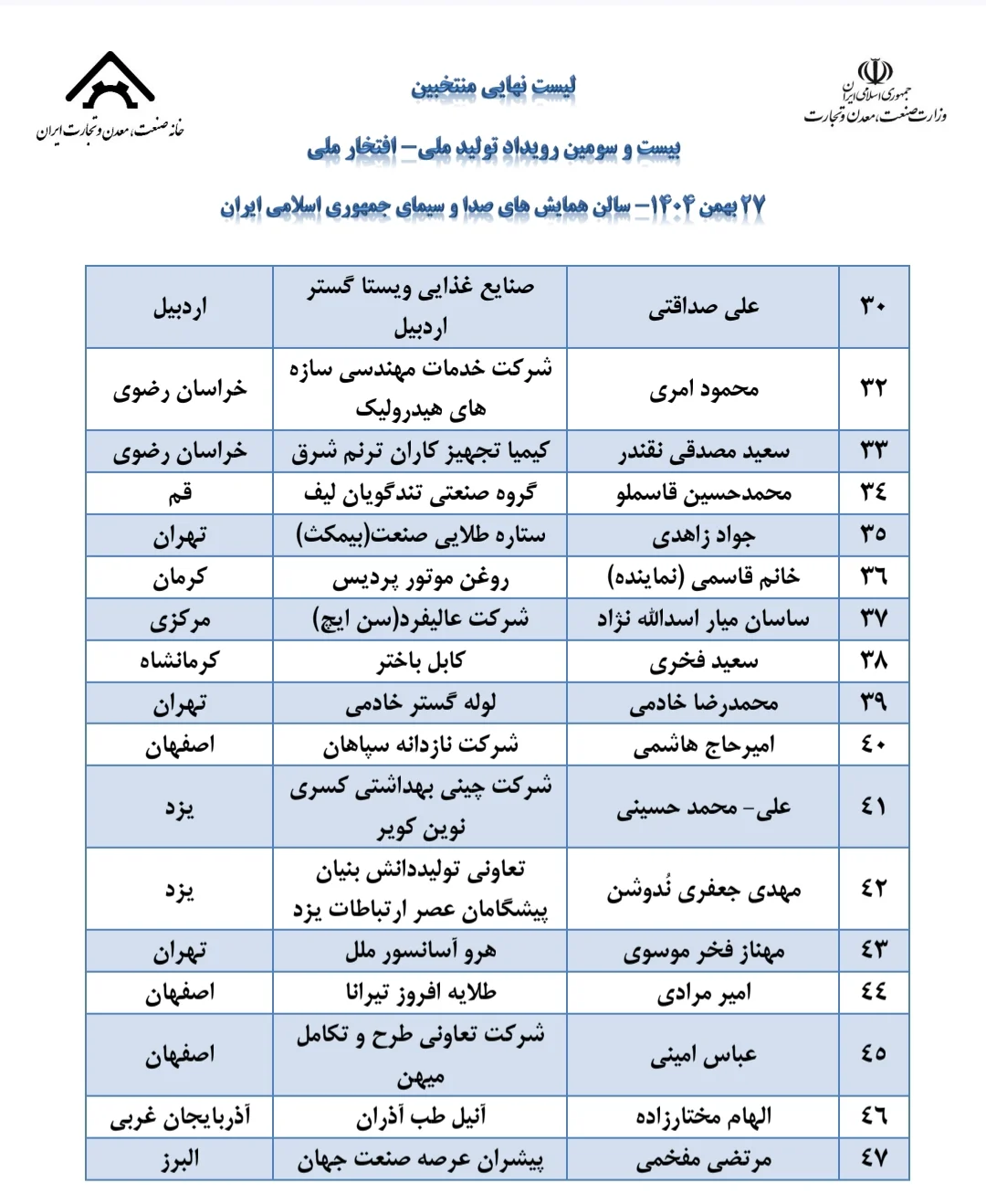 به گزارش خبر حرفه ای از روابطعمومی خانه صنعت، معدن و تجارت ایران، در آیین اختتامیه بیستوسومین رویداد «تولید ملی – افتخار ملی»، اسامی 47 واحد برگزیده تولیدی، صنعتی، معدنی و خدمات فنی و مهندسی اعلام شد.