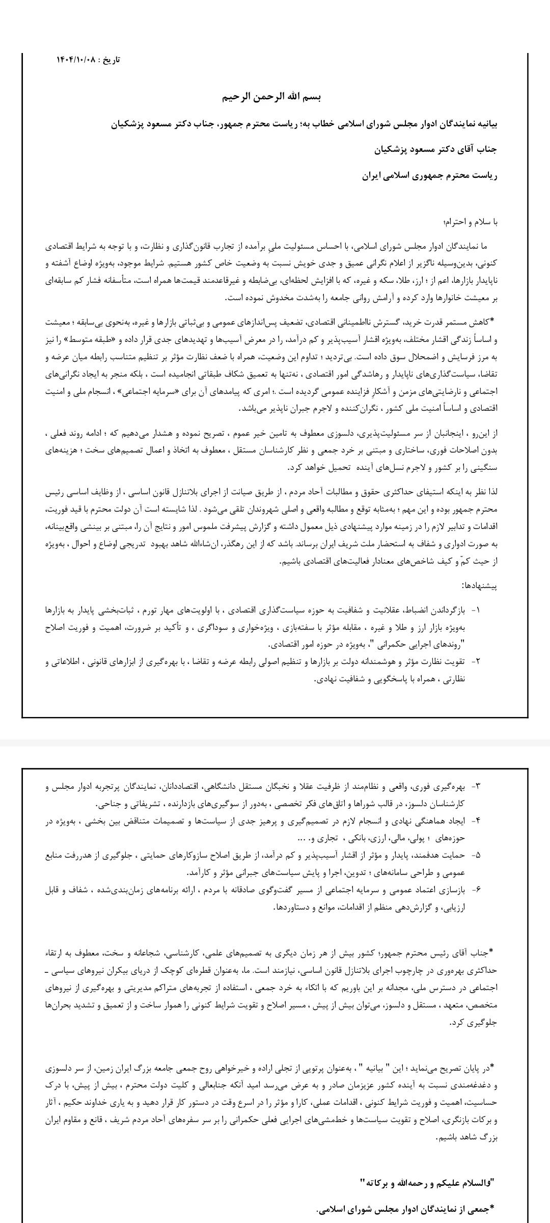 نامه ۹۸۱ نماینده ادوار مجلس به پزشکیان برای مهار تورم
