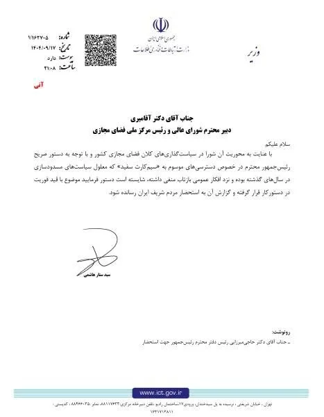 نامه وزارت ارتباطات درباره اینترنت سفید با قید فوریت